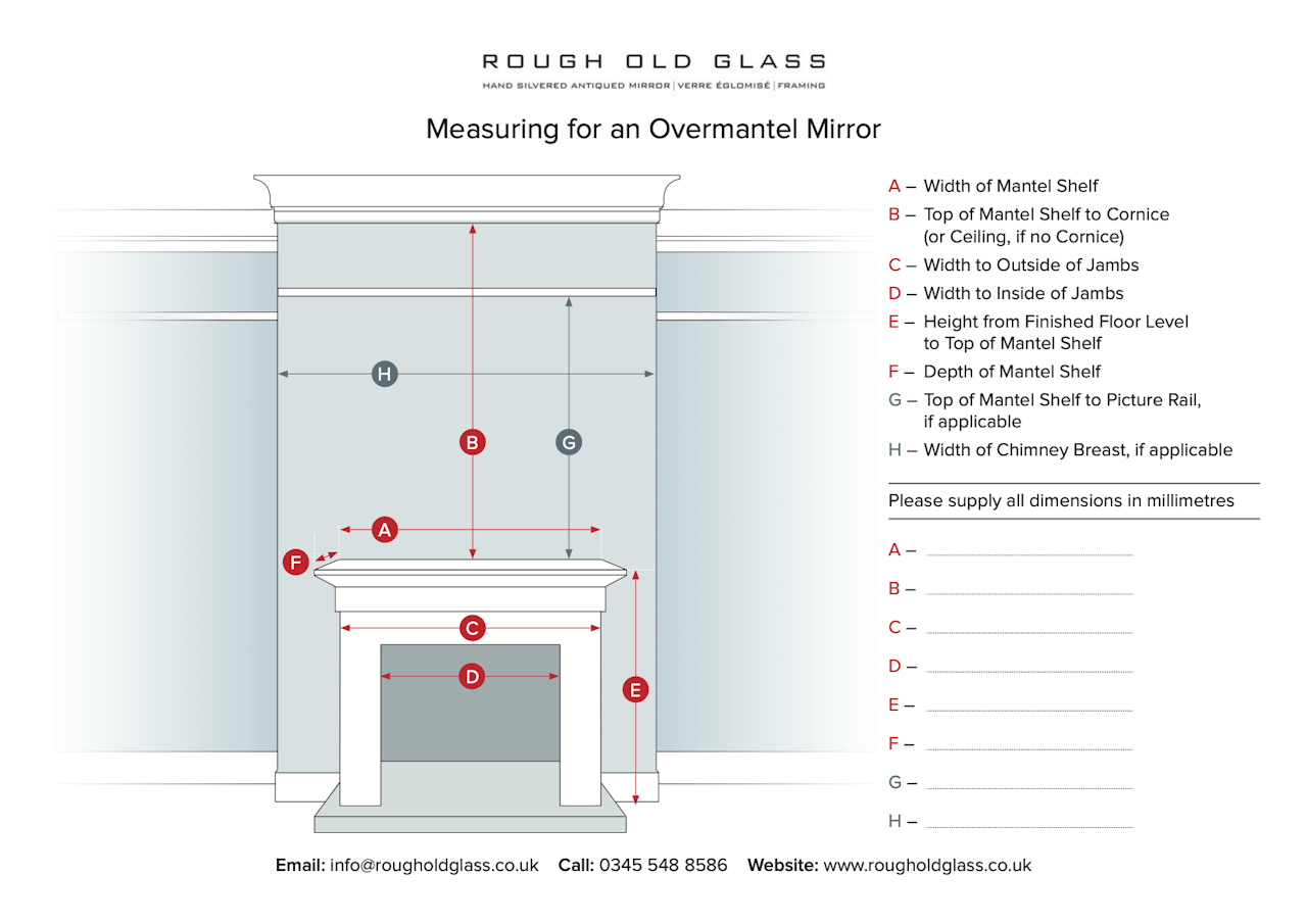 - The mirror glass itself should be approximately the same as the width of the fireplace opening (the measurement between the jambs)